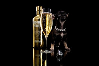 Шампанское на темном фоне. Щенок в ошейнике