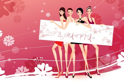 Четыре девушки держат надпись с 8 марта