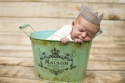 Ребенок с короной на голове сидит в ведре