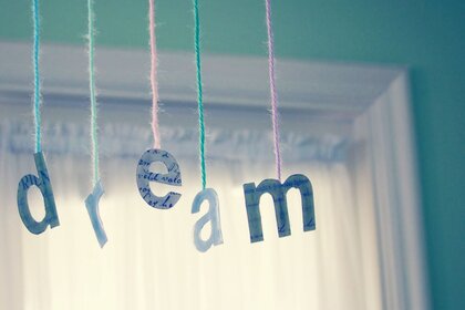 Буквы подвешены на разноцветных нитках