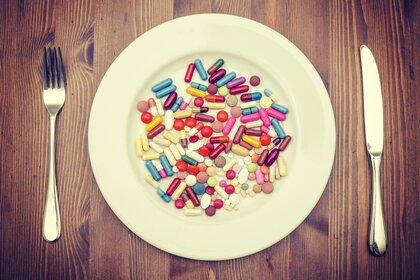 Зож цветные таблетки на тарелке вилка нож