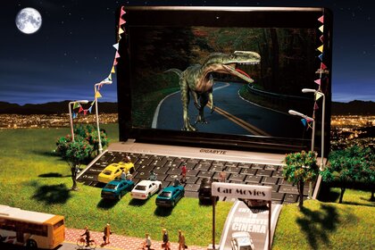 Динозавр на экране уличного кинотеатра