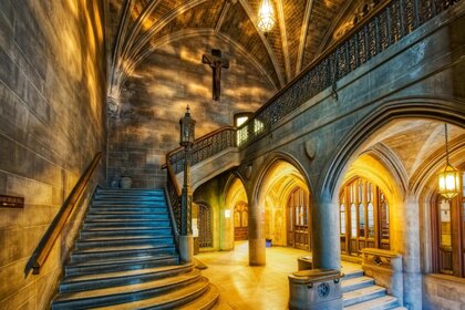 Широкая лестница внутри здания с прекрасной архитектурой в тёплых жёлтых тонах