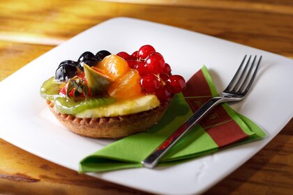Десерт с малиной на тарелке с вилкой
