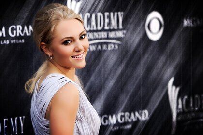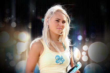 Улыбающаяся знаменитая актриса на фоне эмблемы