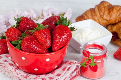 Миска с клубникой на столе и круассан