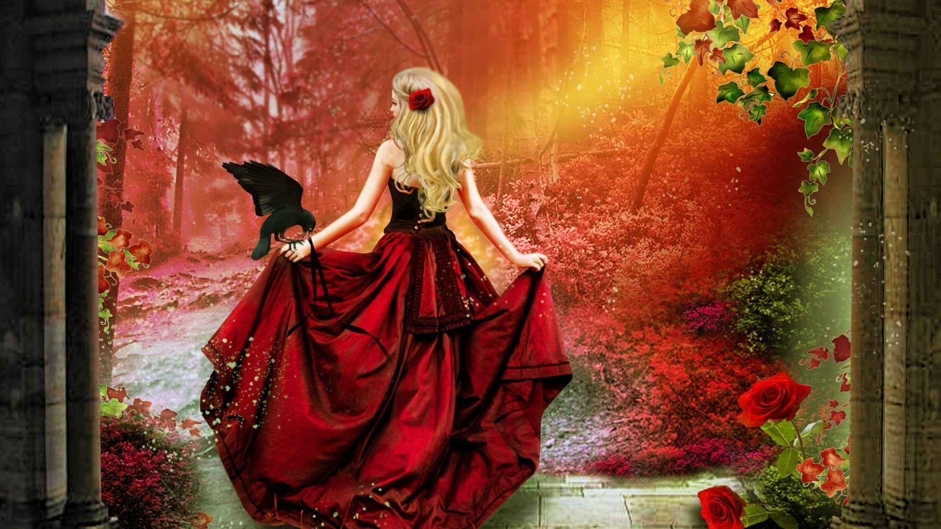 Красотка в красном платье с розой в волосах - обои на рабочий стол