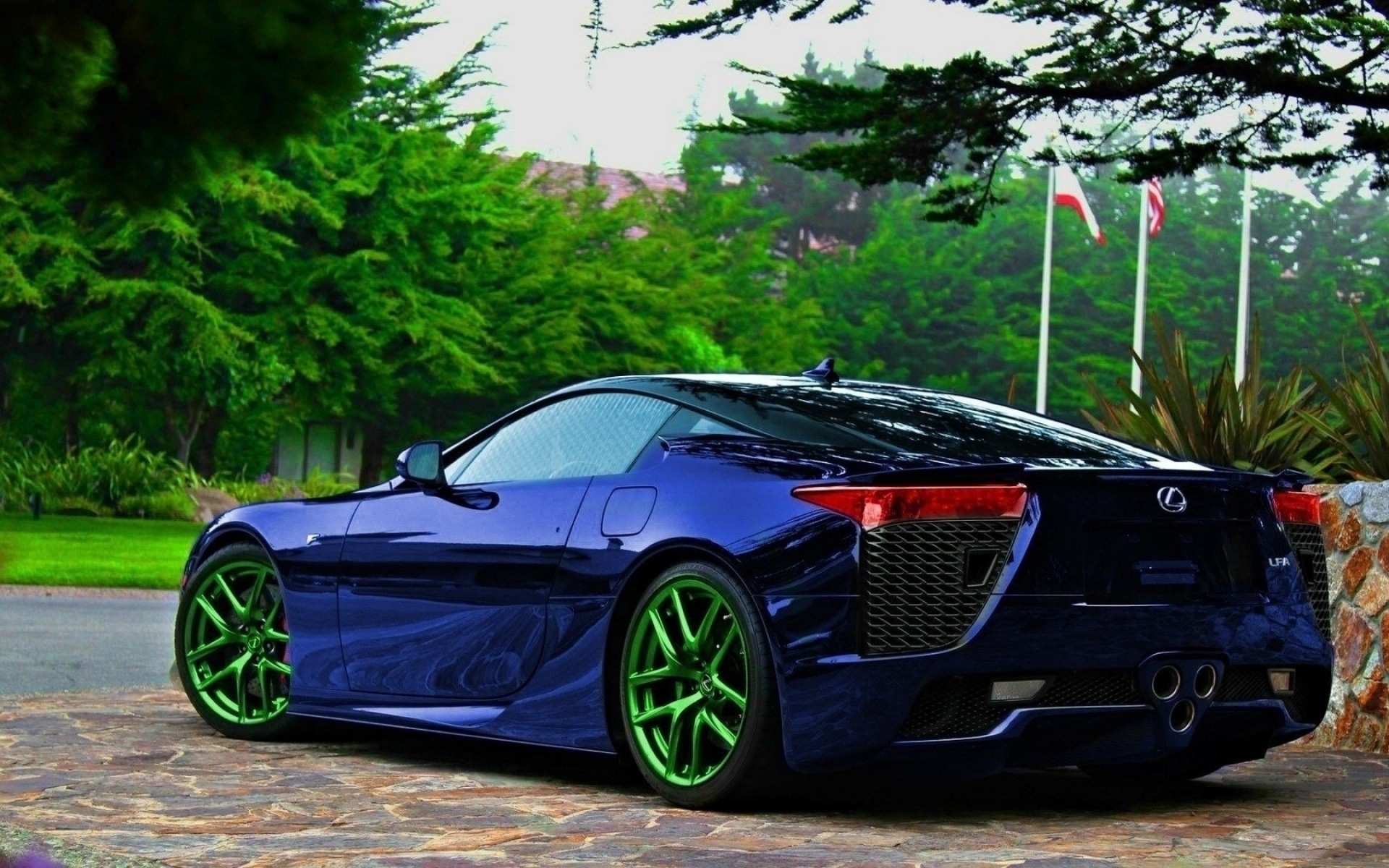 Спортианый синий автомобиль с зелеными колесами - обои на рабочий стол