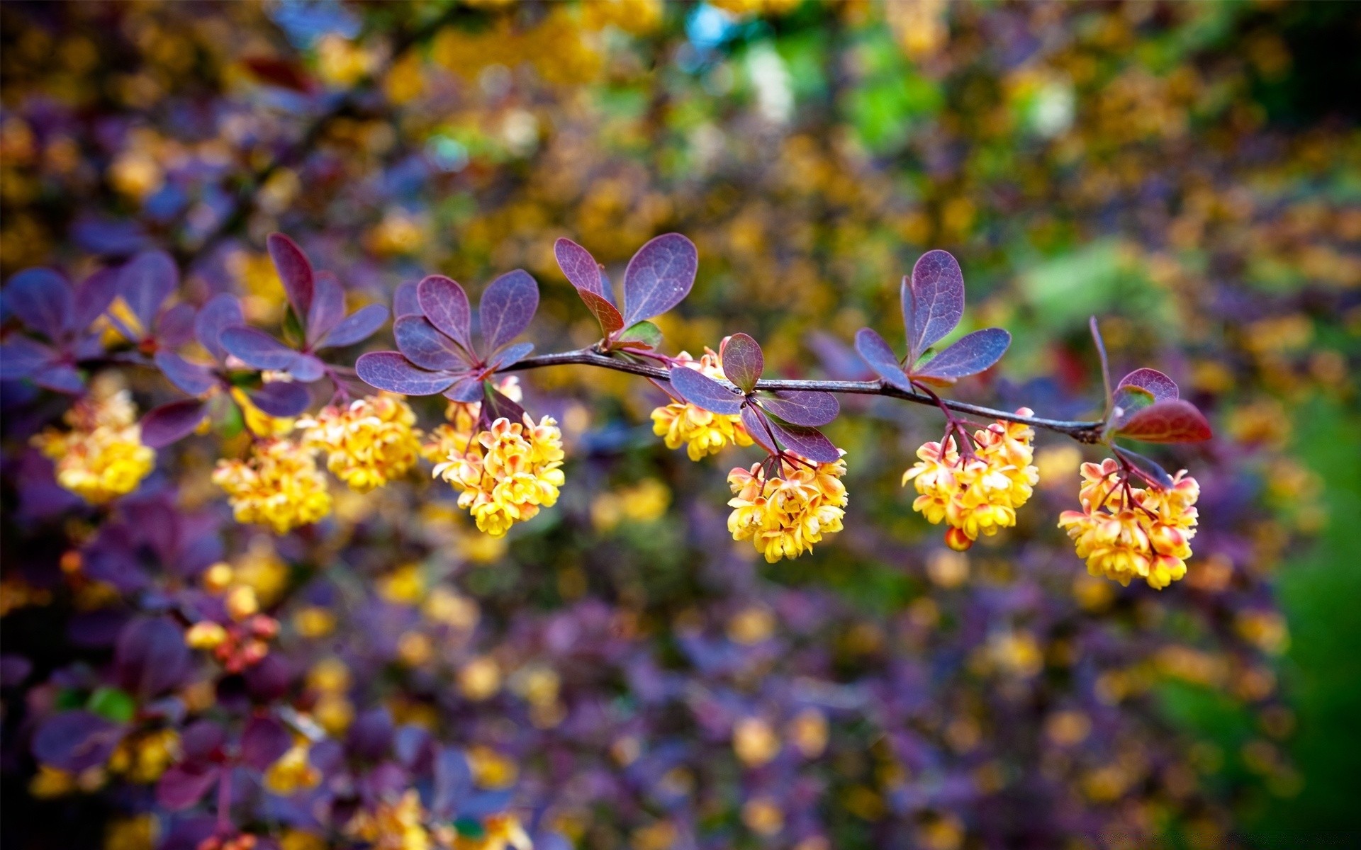 Ветка с желтыми цветочками и фиолетовыми листьями - обои на рабочий стол