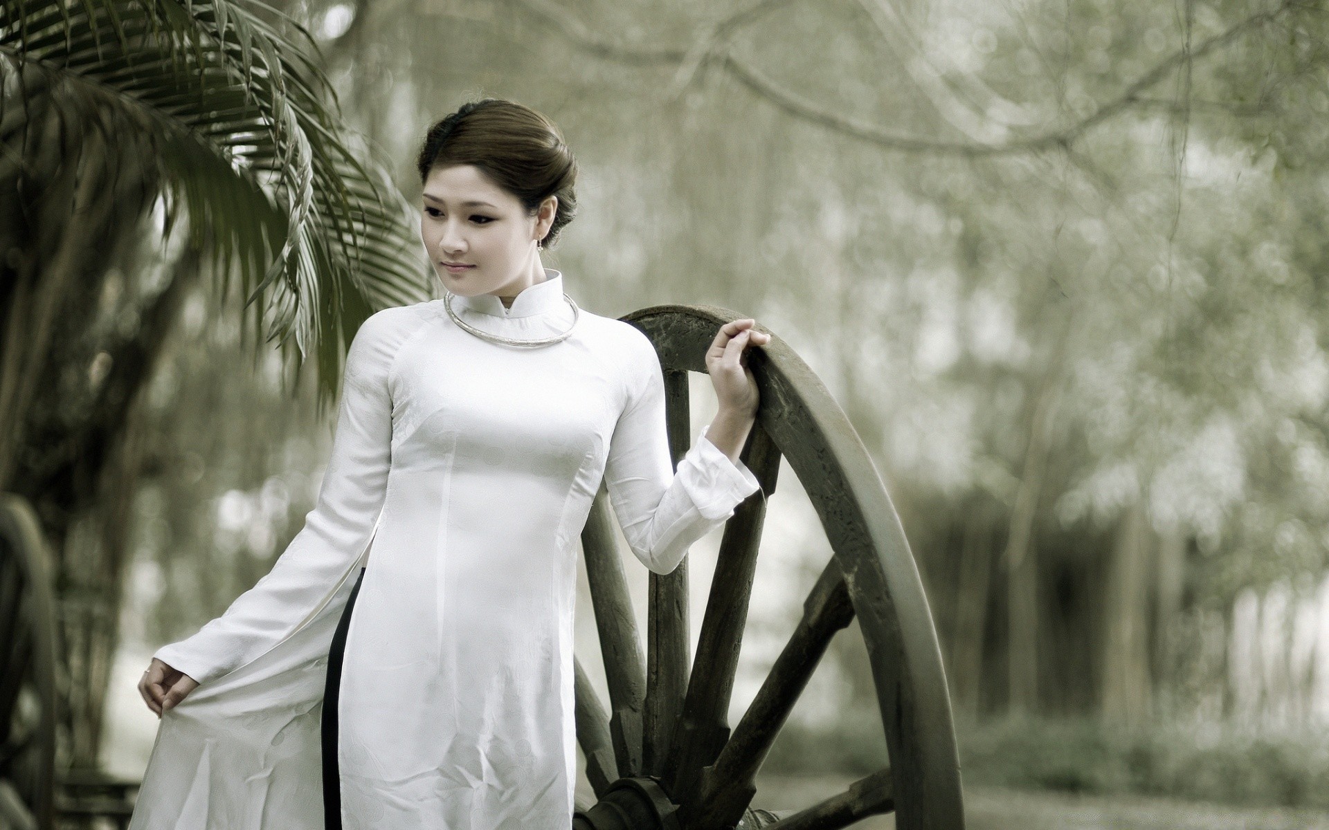 Девушка азиатка в закрытом белом платье опирается рукой на большое деревянное колесо - обои на рабочий стол