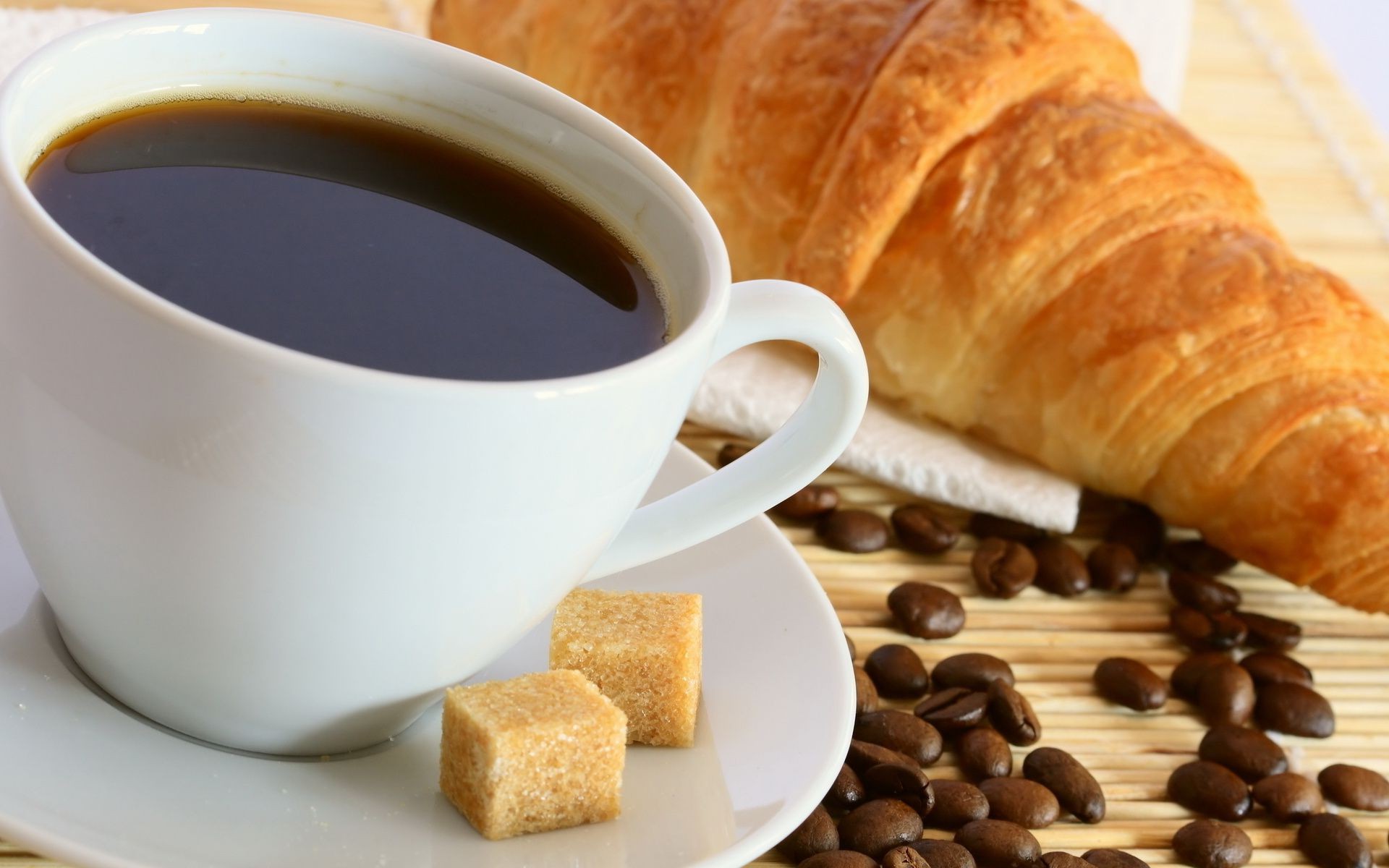 кофе завтрак рассвет кубок круассан пить еда эспрессо горячая кондитерский хлебопекарни континентальный блюдце хлеб сладкий кофеин вкусные сахар плюшка