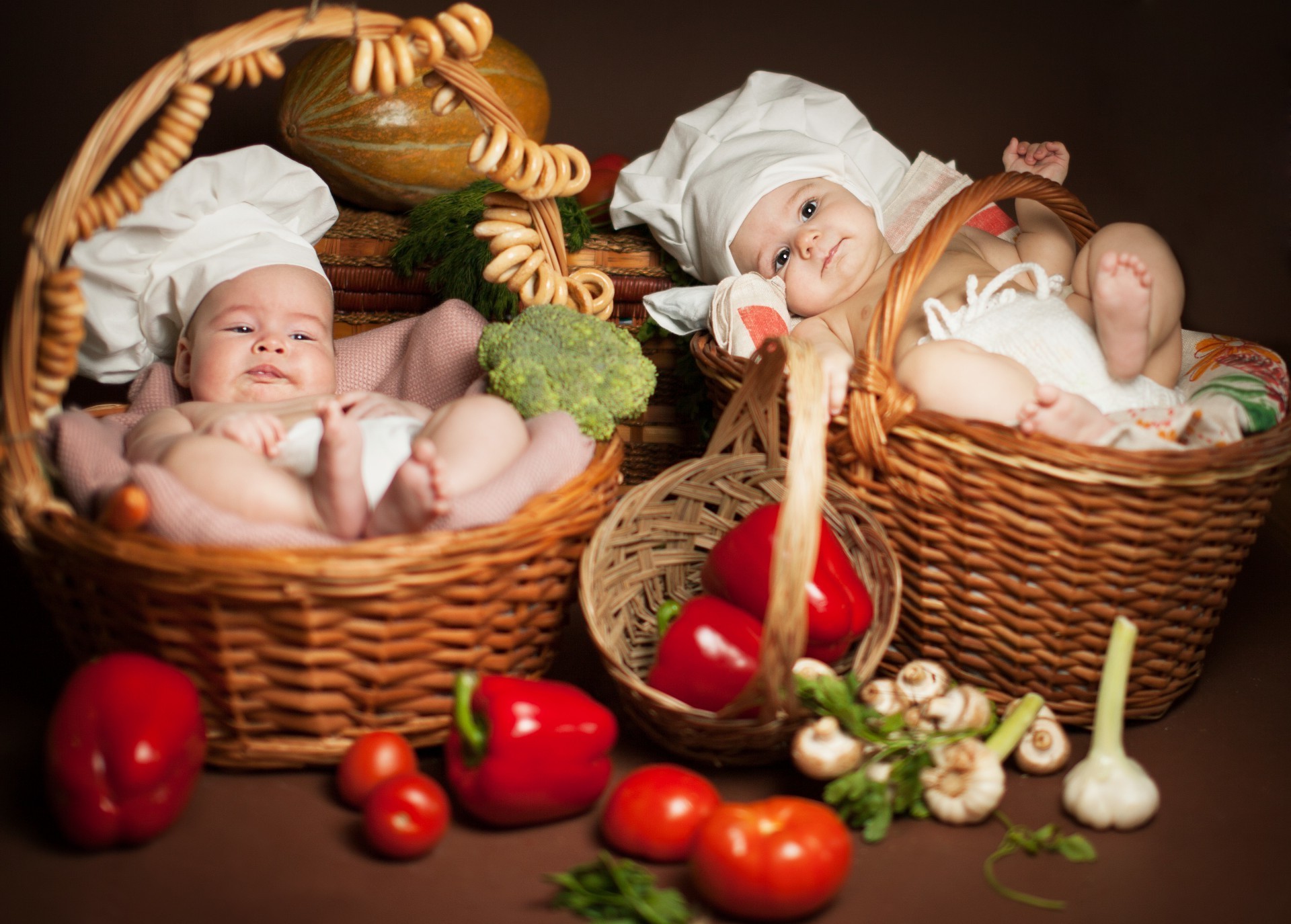 Два юных поваренка отдыхают в корзинках с продуктами - обои на телефон