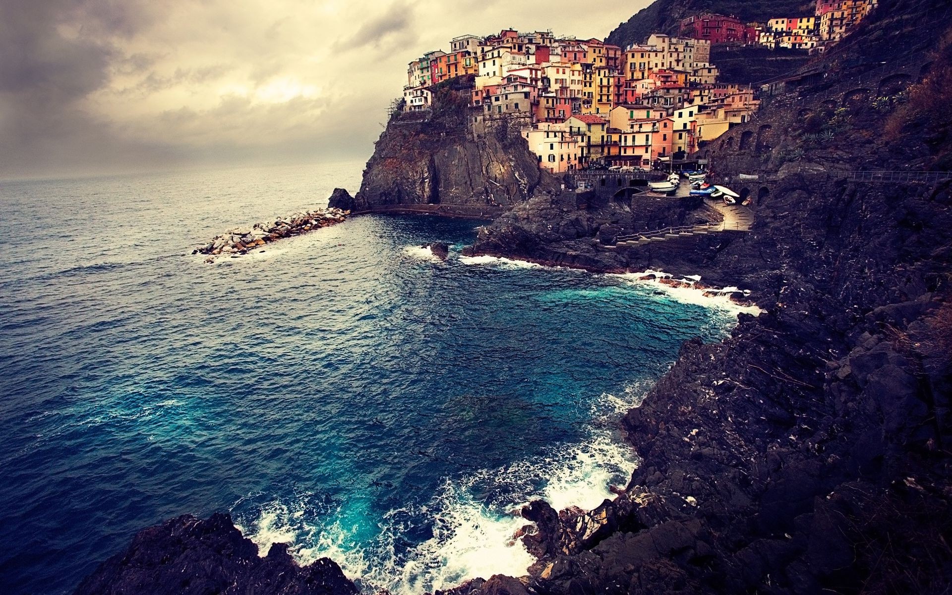 Дома на скале у синего моря - обои на рабочий стол
