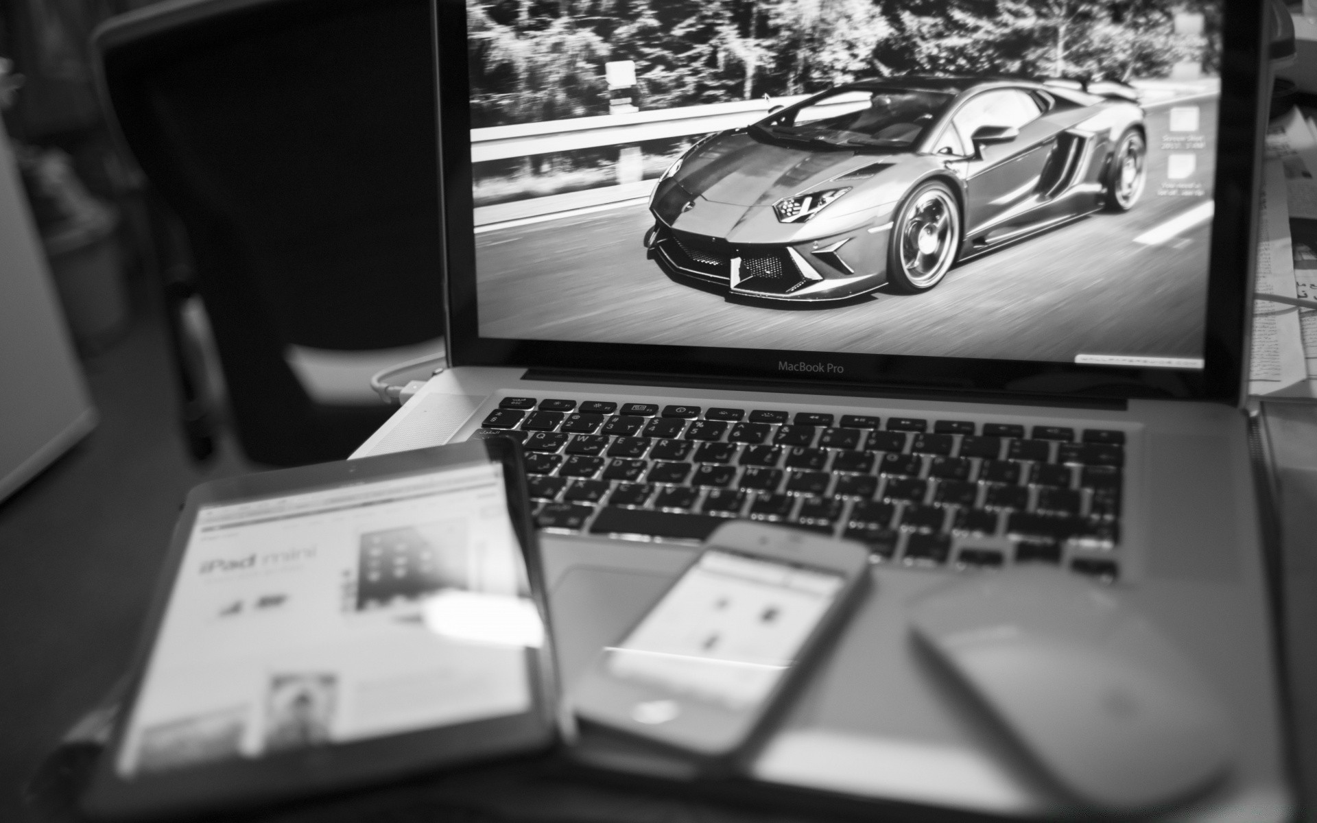 На мониторе ноутбука фото серой машины - обои на рабочий стол