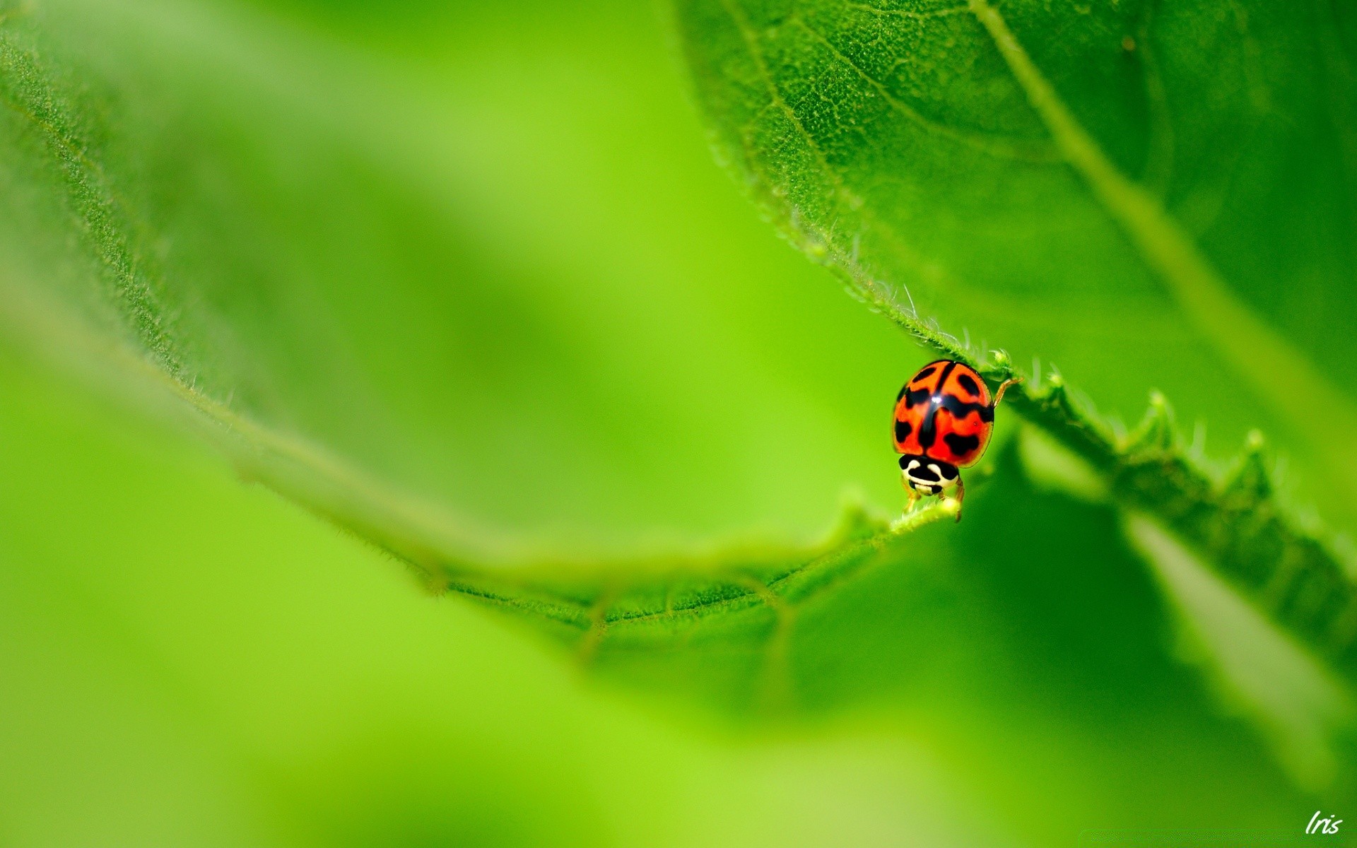 Божья корова путешествует по поверхности зеленых листьев - обои на рабочий стол
