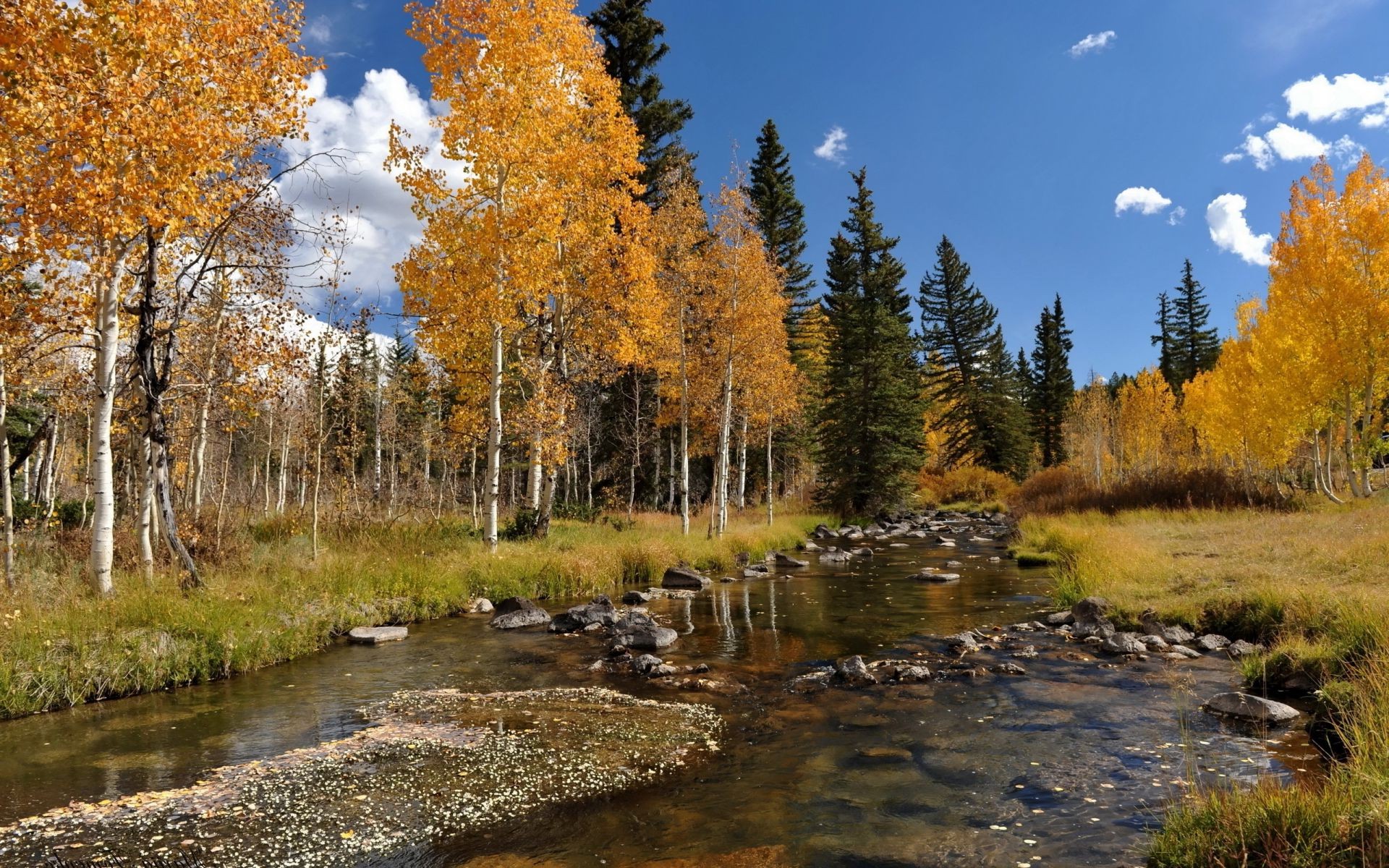 Березы и деревья вдоль речки - обои на рабочий стол