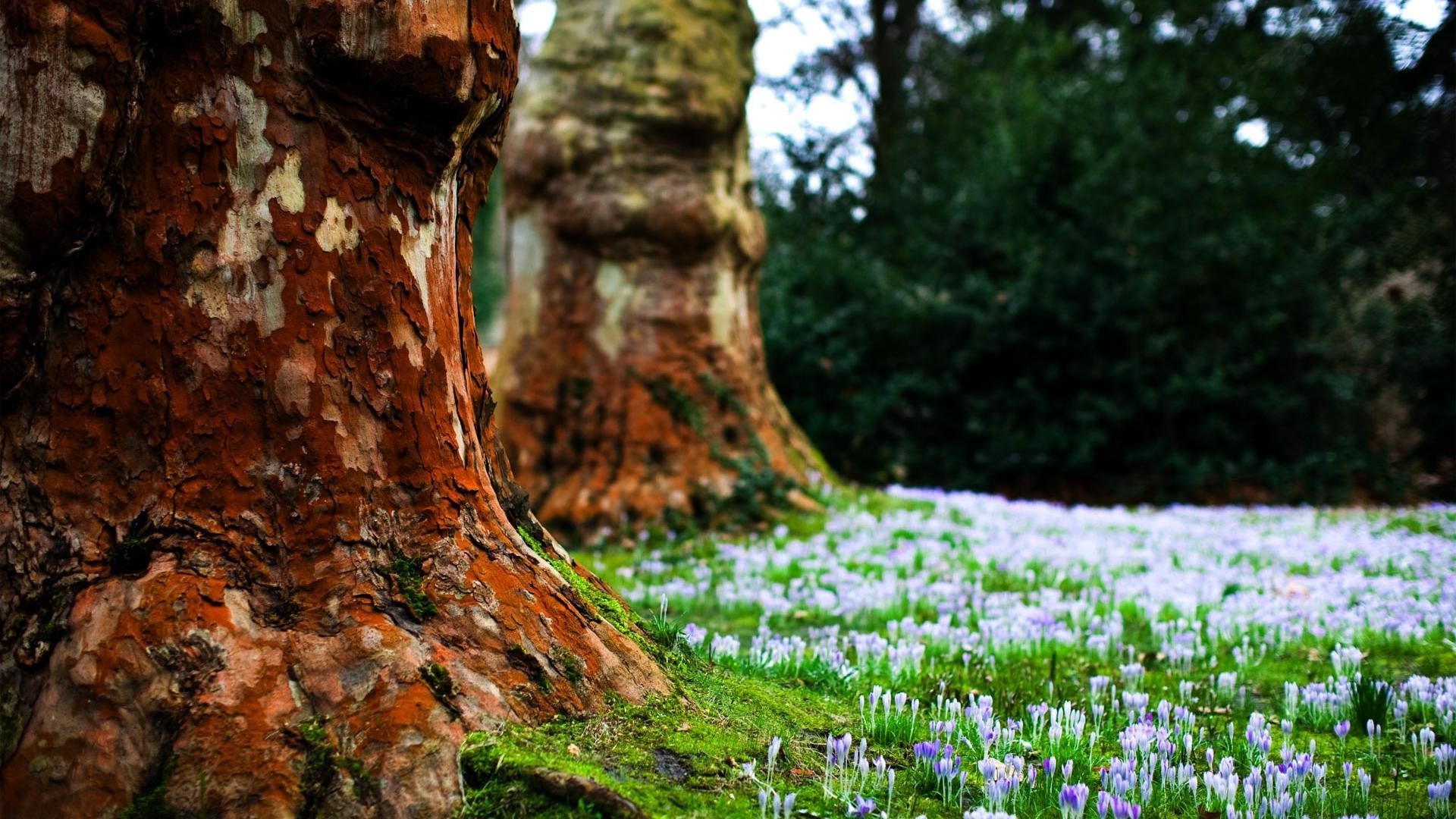 Фиолетовые цветы у старых стволов деревьев - обои на рабочий стол