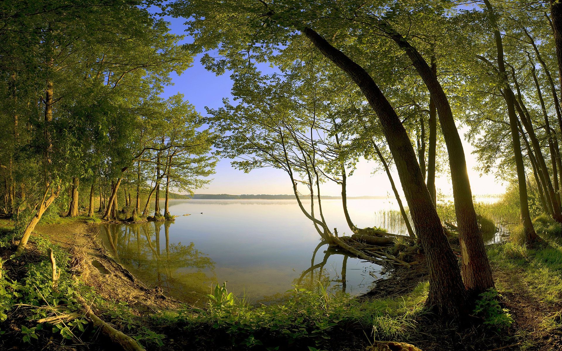 Природный пейзаж с зелёными деревьями и озером - обои на рабочий стол
