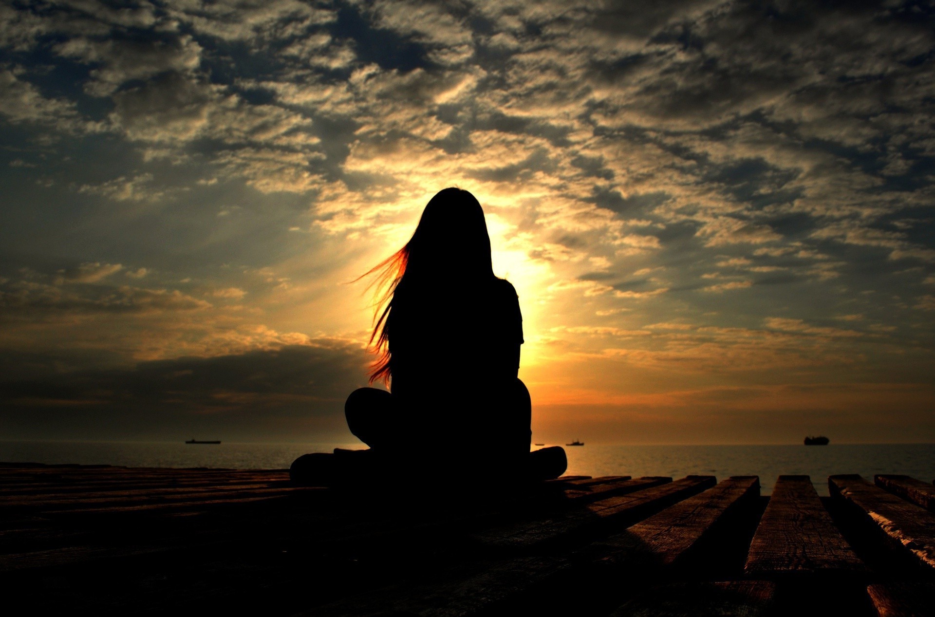 Силуэт девушки сидящей в позе лотоса закрыл солнце - обои на рабочий стол