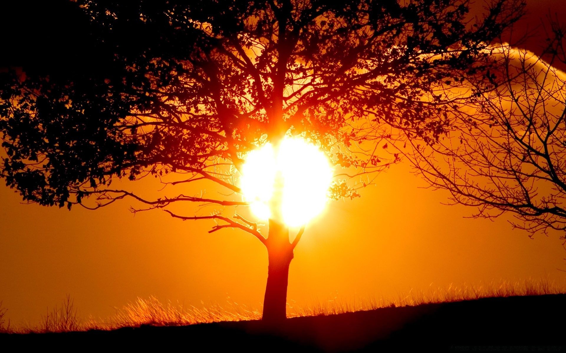 Удивительный закат сквозь ствол дерева на фоне яркого оранжевого неба - обои на рабочий стол