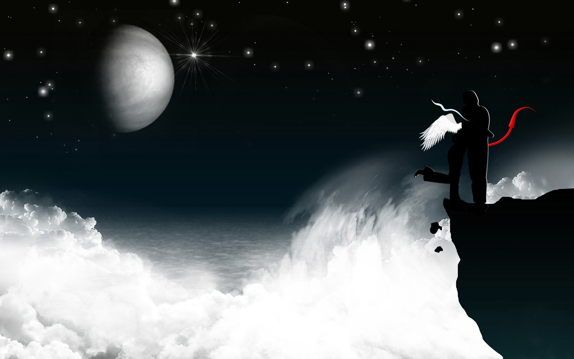 Ангел и демон обнимаются стоя на скале в облаках - обои на телефон