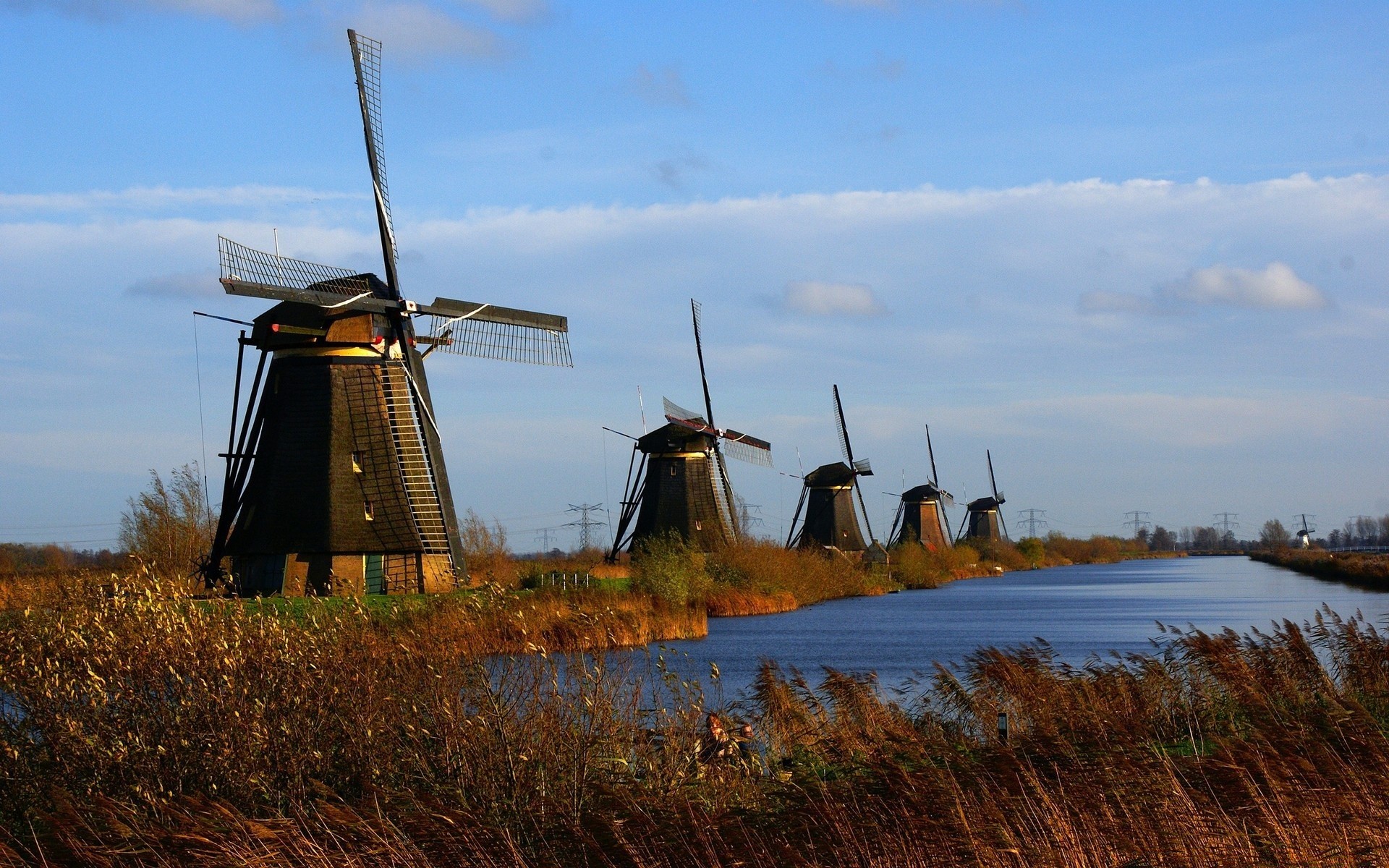 Ветряные мельницы вдоль реки на осеннем пейзаже - обои на телефон