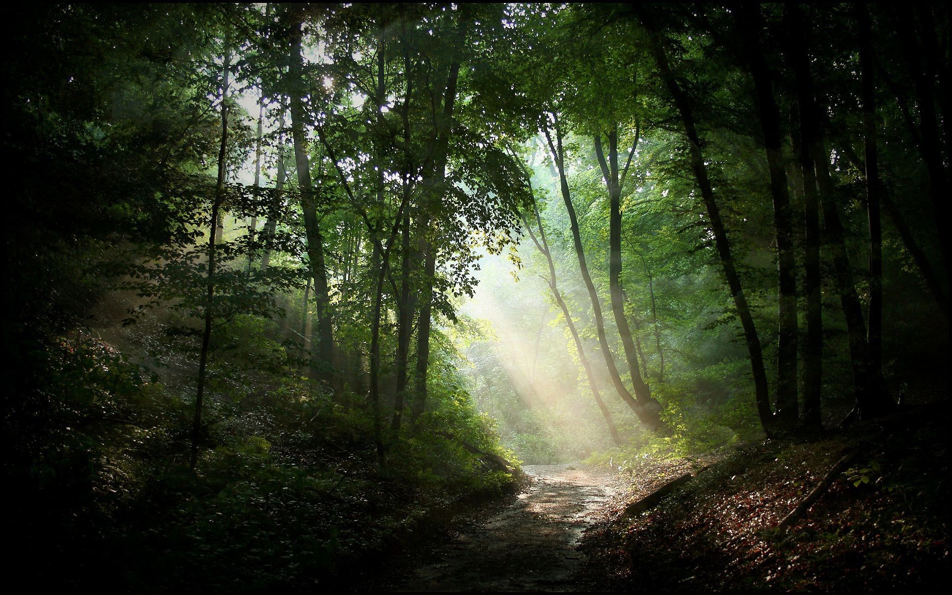 Загадочная лесная чаща, лучи солнца сквозь листву - обои на телефон
