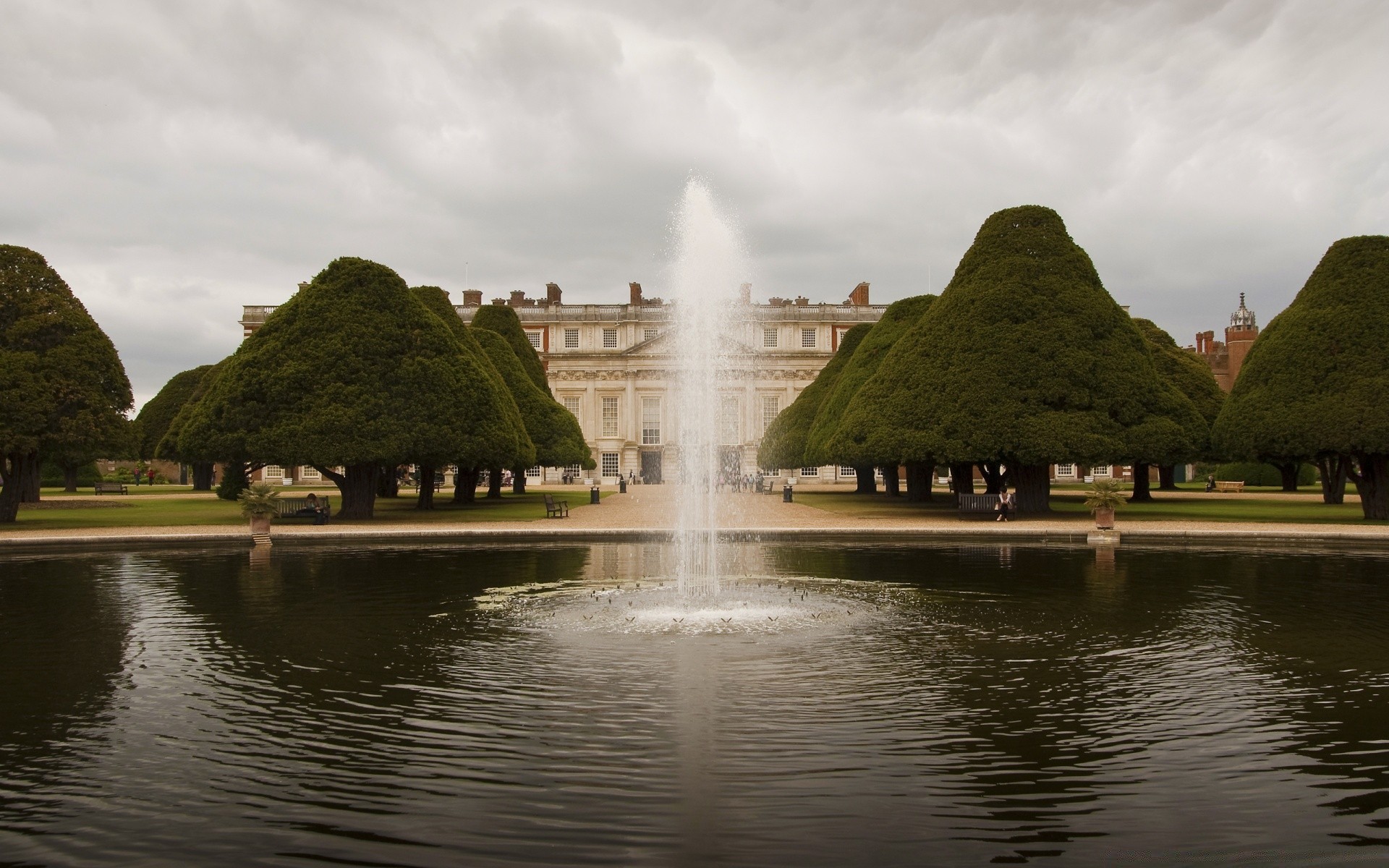 Фонтан на озере где-то в Европе - обои на рабочий стол