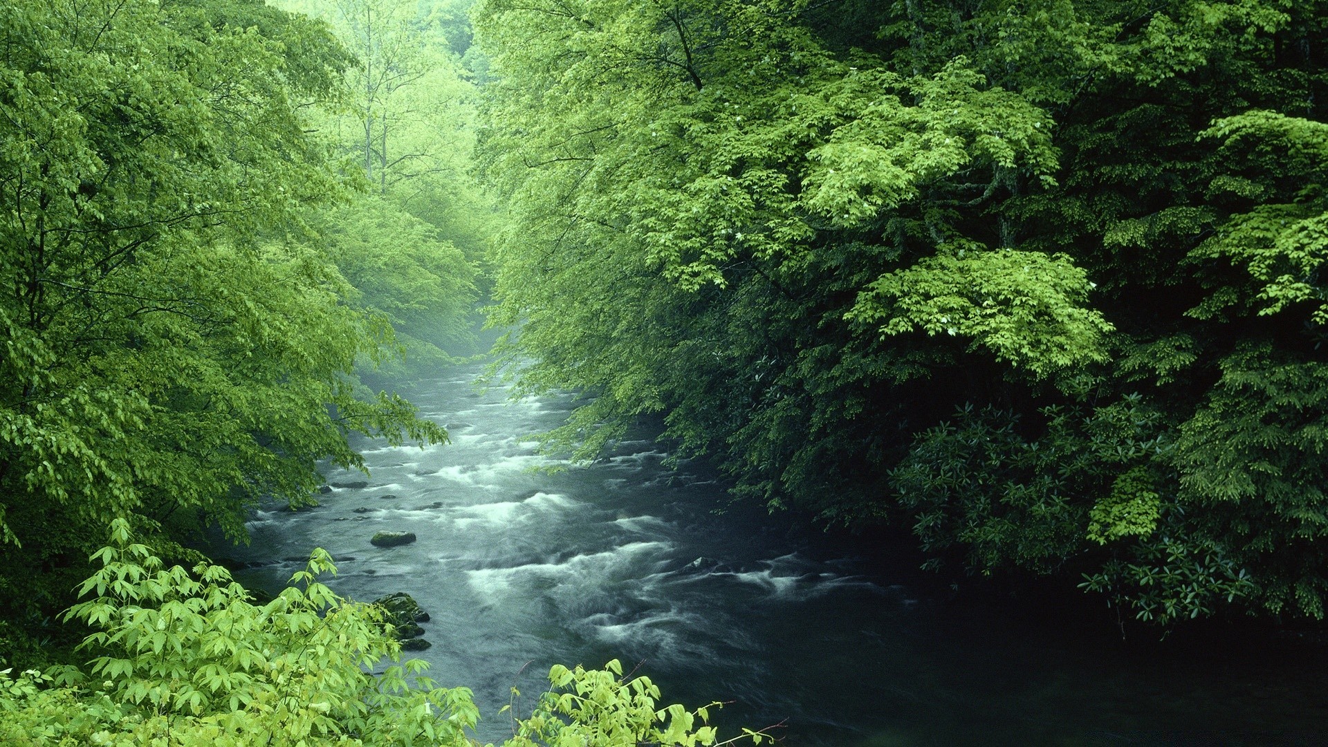 Река среди зелёного леса - обои на рабочий стол