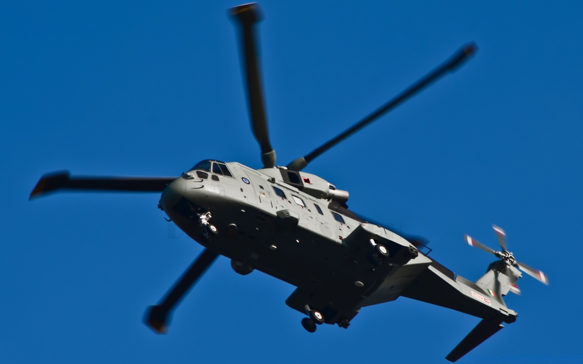 Группа военных вертолетов на взлетном поле на фоне закатного солнца