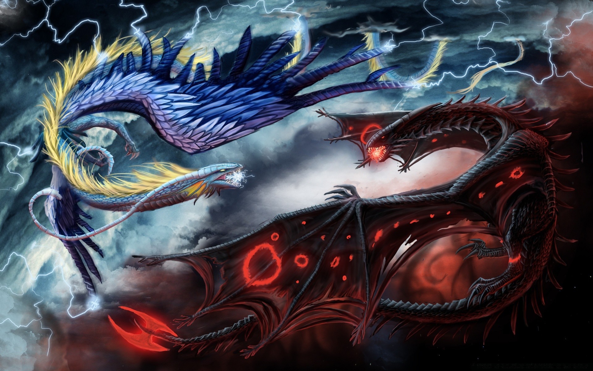 Битва драконов огня и грома. фэнтези драконы. стихии