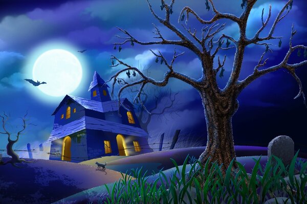 Картинка хеллоуин ночь полнолуние дом могила зловеще страшноКартинка Хеллоуин ночь полнолуние дом могила зловеще страшно