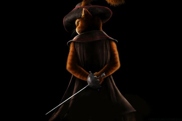 Кот в сапогах со шпагой на черном фоне