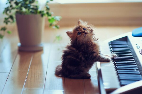 Кошка в помещении играющая на синтезаторе