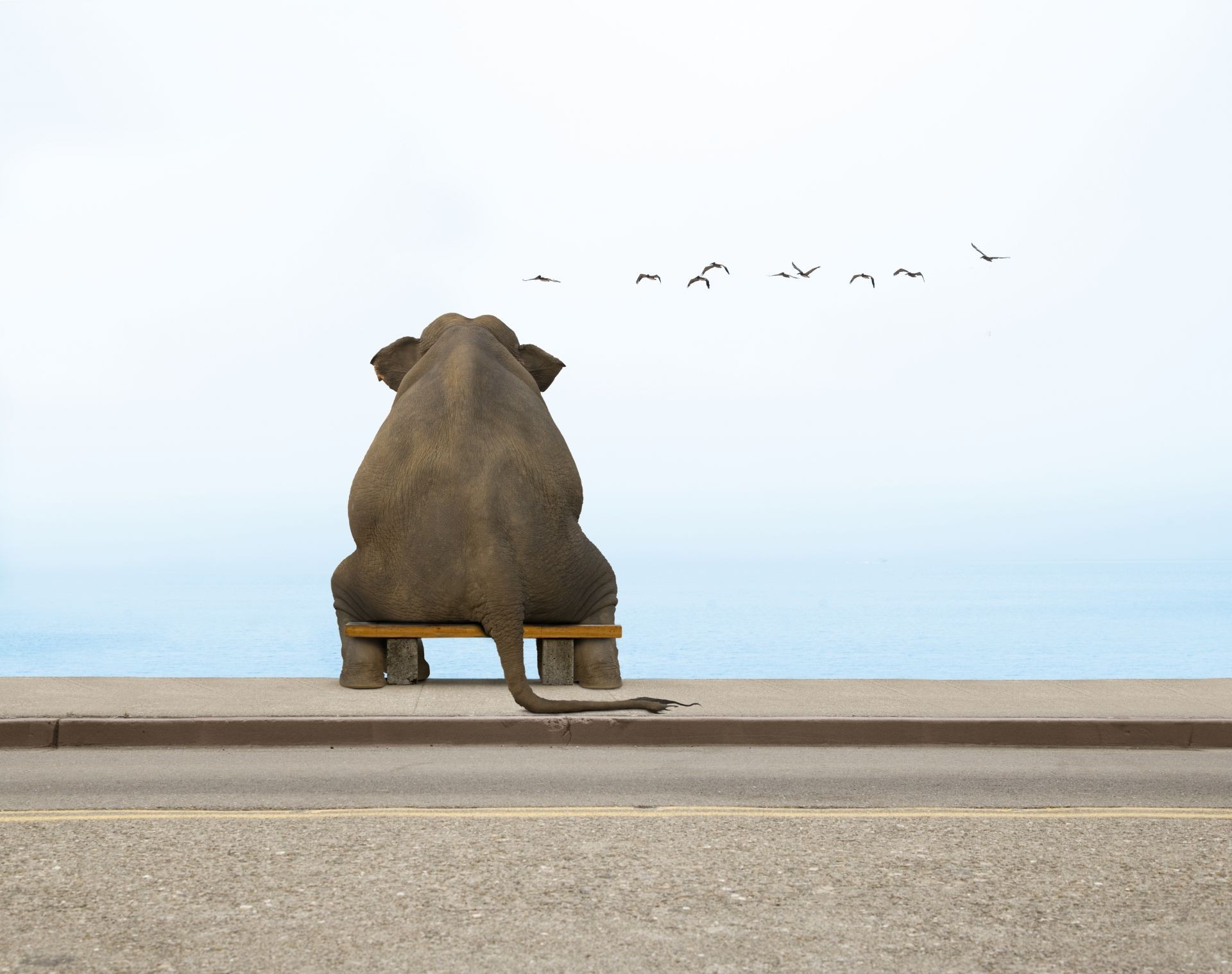 Изображение сидящего на скамейке слона