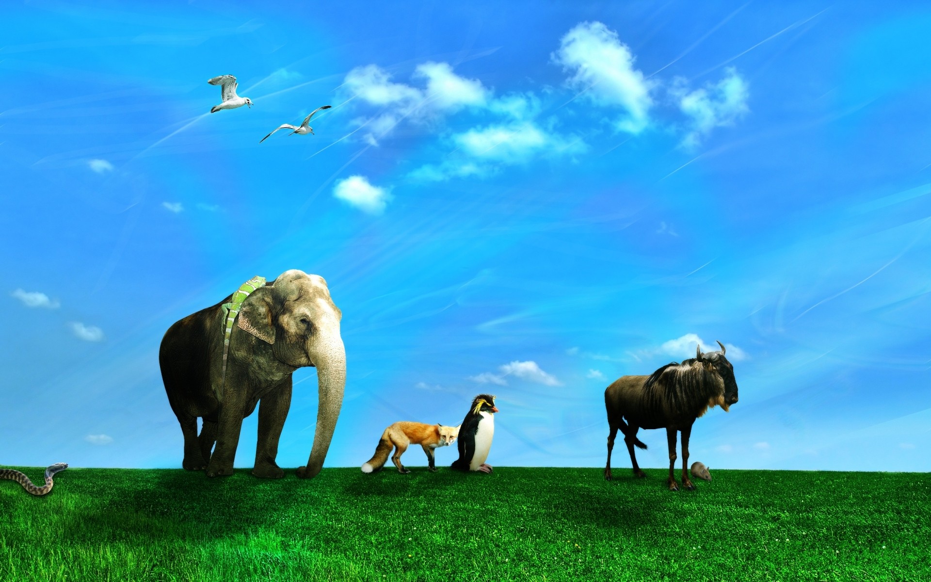 Невозможное возможно стадо из слона пингвина зубра и лисы, сюр