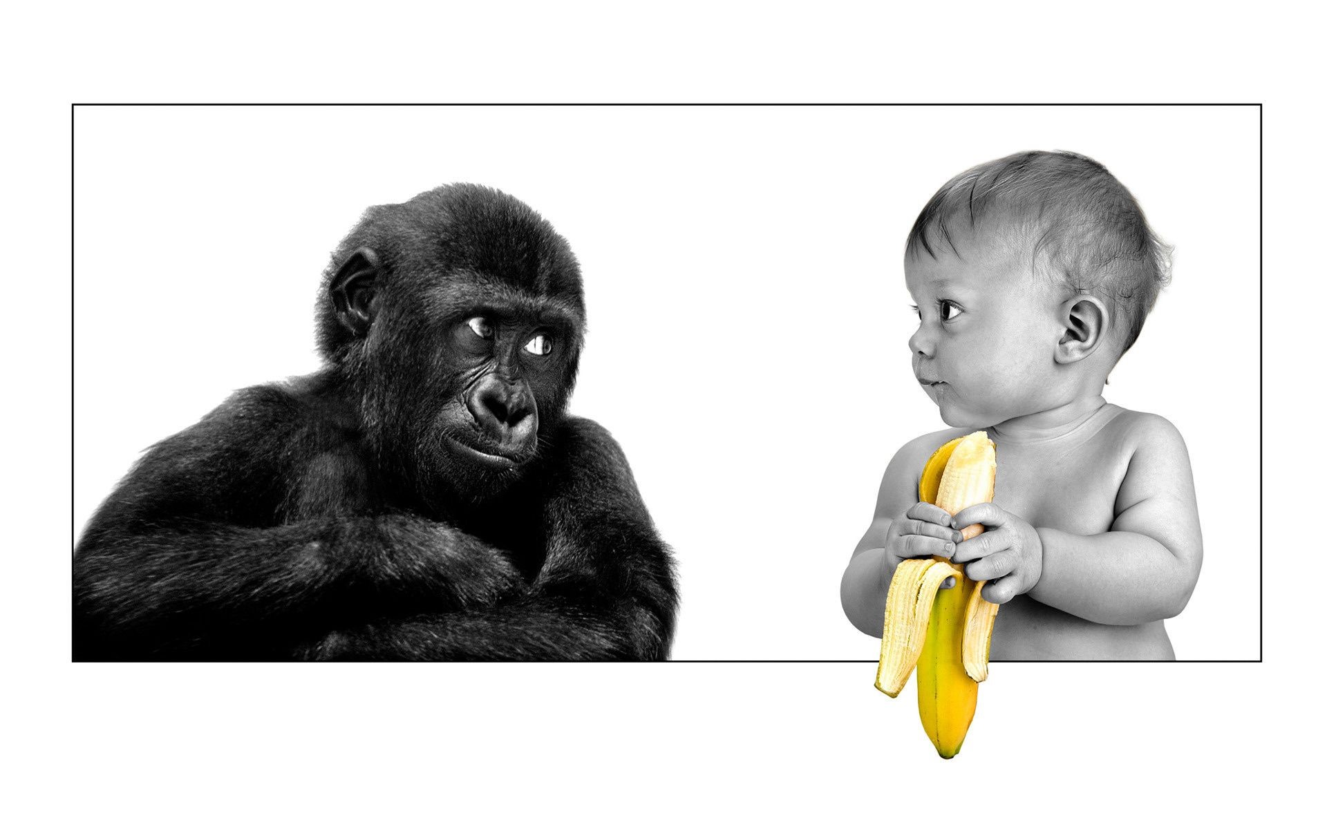 Шимпанзе смотри на ребенка, держащего в руке банан