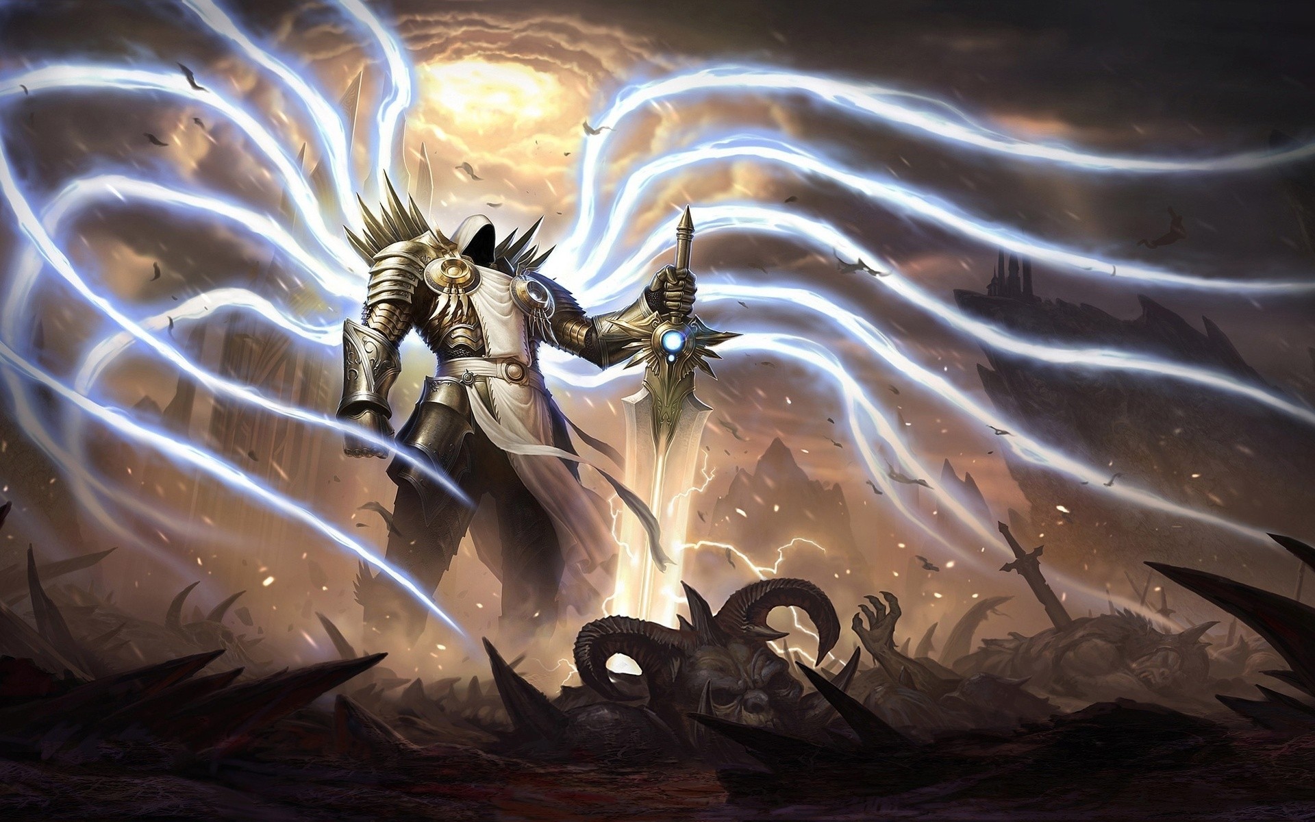 Diablo. Персонаж в светящемся портале на тёмном фоне