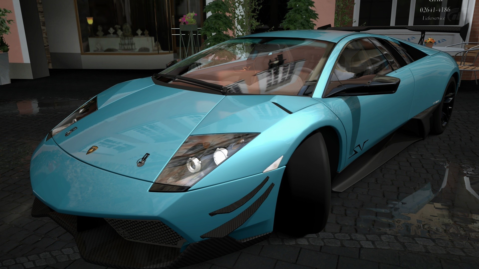Голубой автомобиль в городе в компьютерной игре gran turismoГолубой автомобиль в городе в компьютерной игре gran turismo