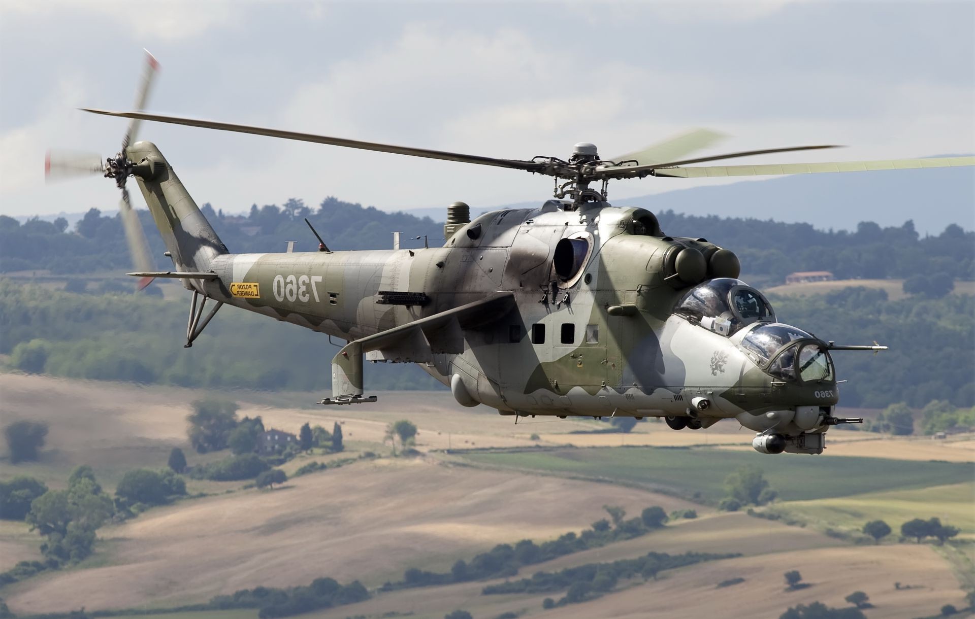Группа военных вертолетов на взлетном поле на фоне закатного солнца