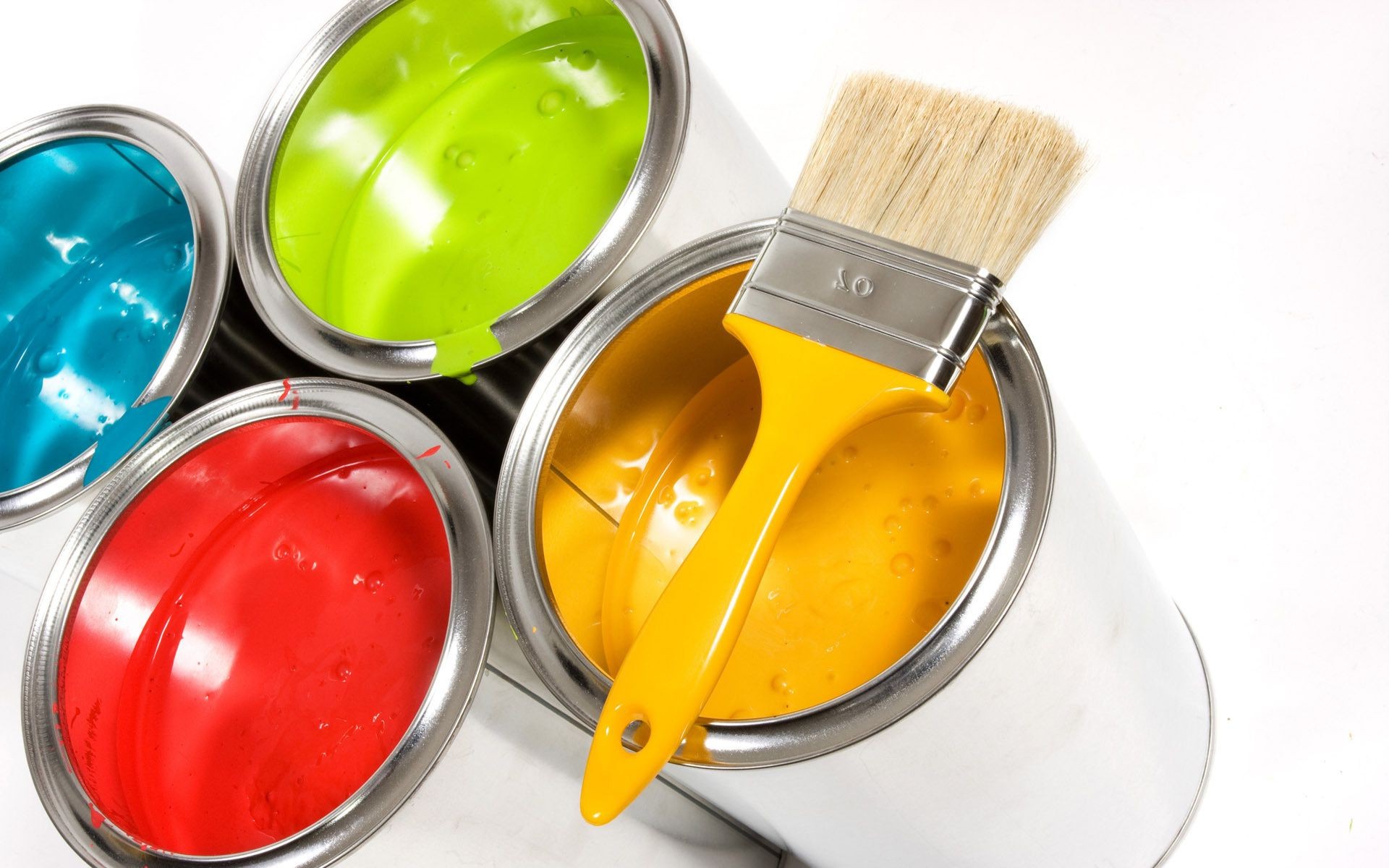 4 банки красок разных цветов и кисть