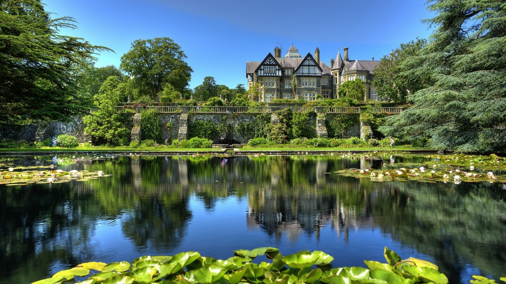 Старый замок в саду с озером