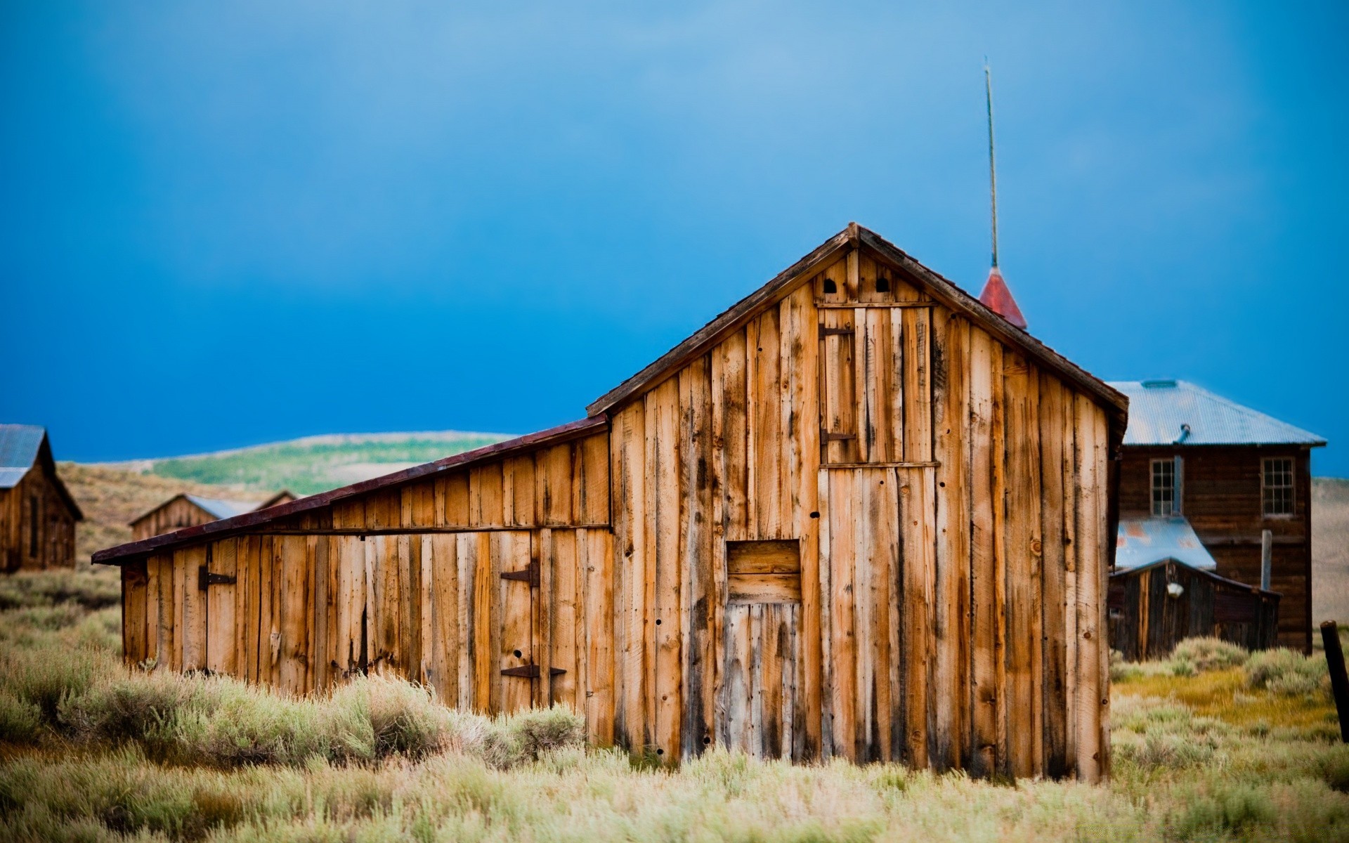 Деревянный сарай на зеленом поле