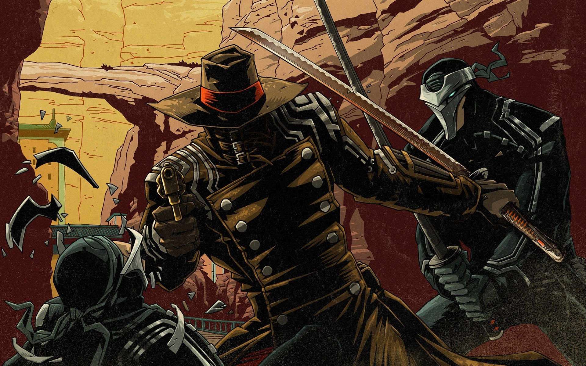 Атака ниндзя с мечами на человека с пистолетом - обои на рабочий стол