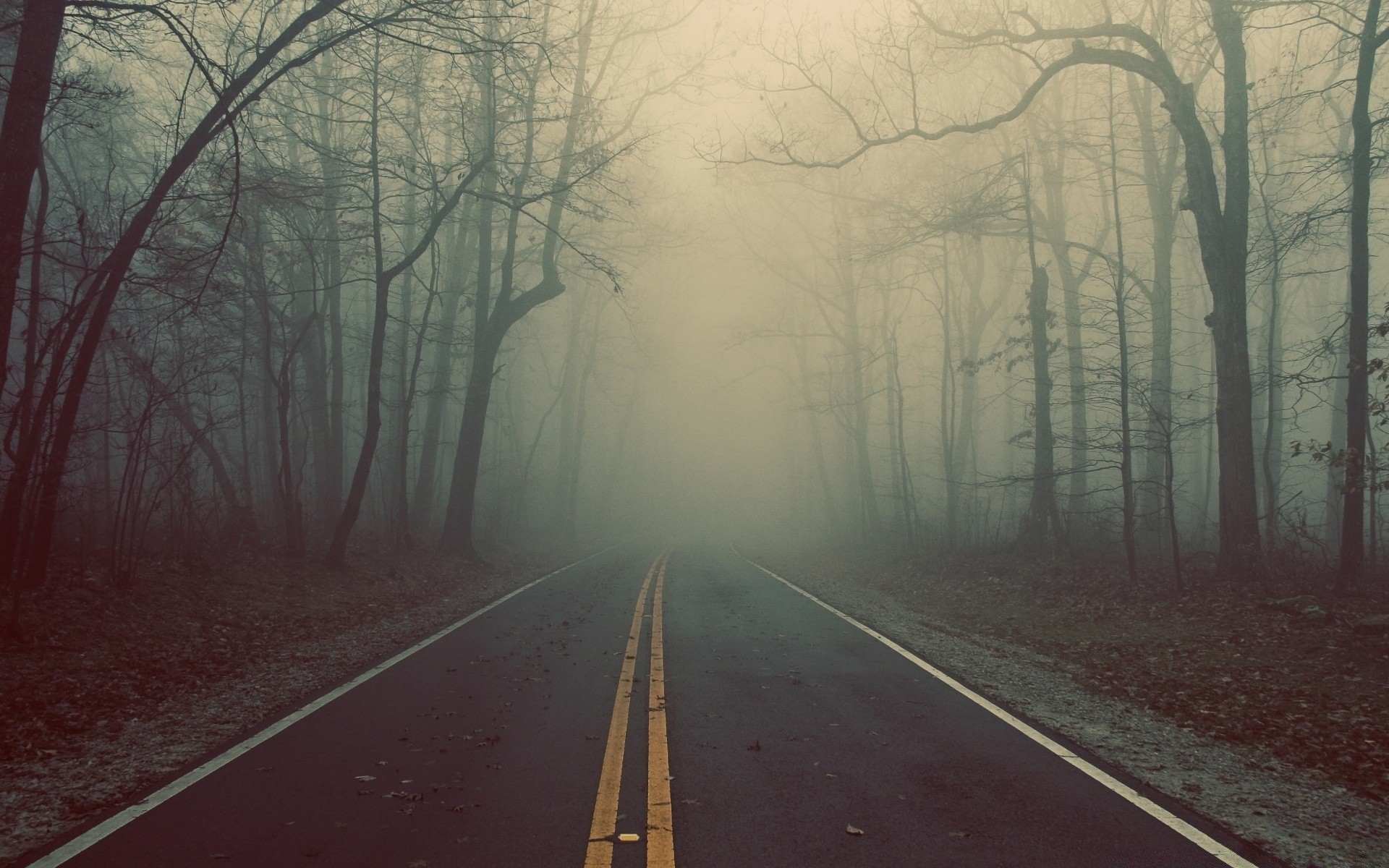 Дорога и деревья в туманном лесу - обои на рабочий стол