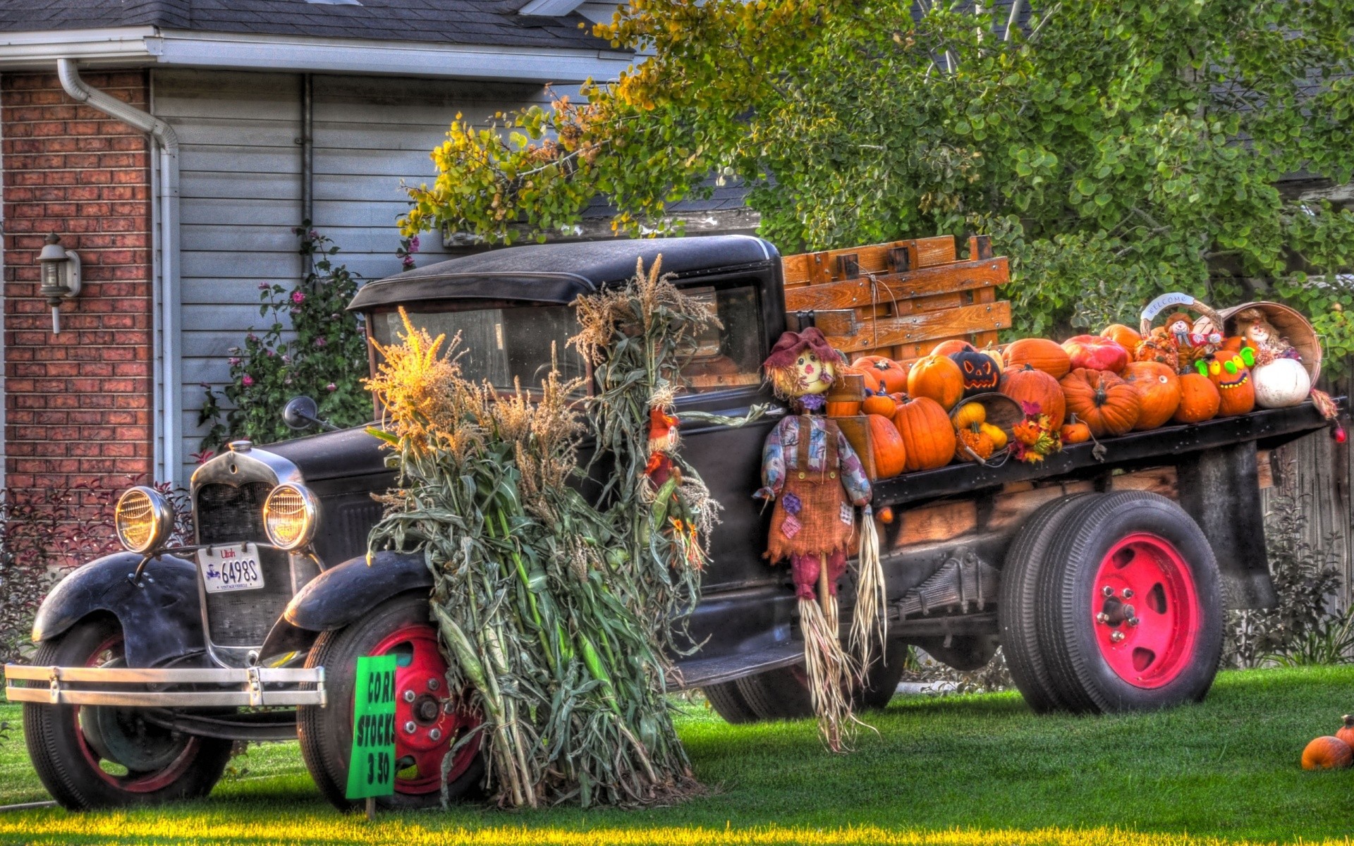 Ретро автомобиль украшенный к хэллоуину куклами, снопами и тыквами - обои на рабочий стол
