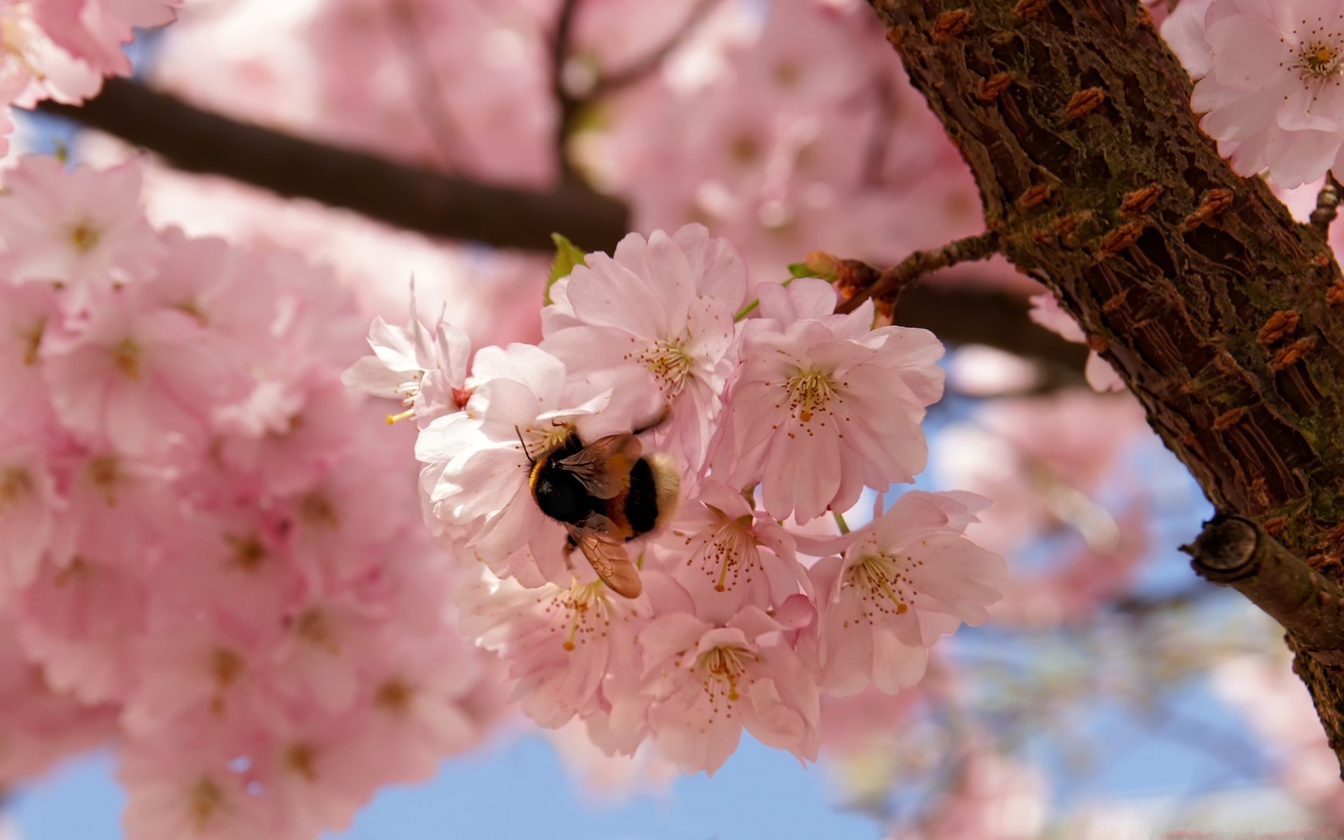 Шмель в розовых цветках дерева - обои на рабочий стол