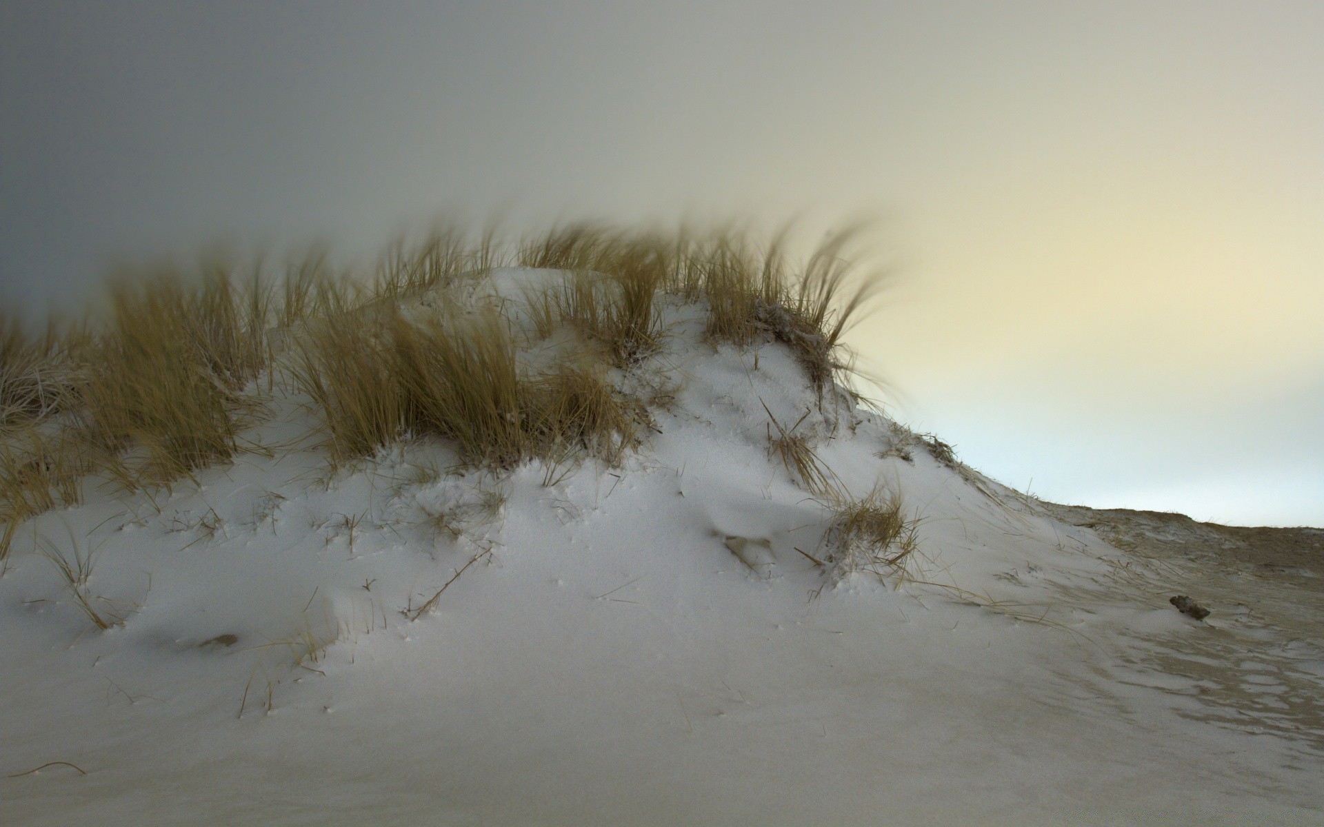 Заснеженный холм с травой в тумане - обои на рабочий стол