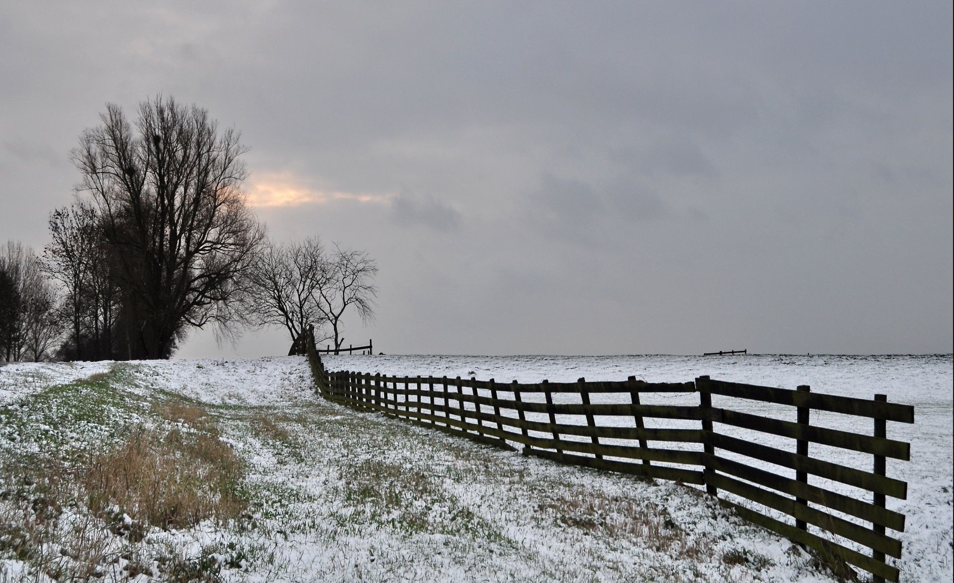 Зима серое деревья поле забор небо иней - обои на телефон