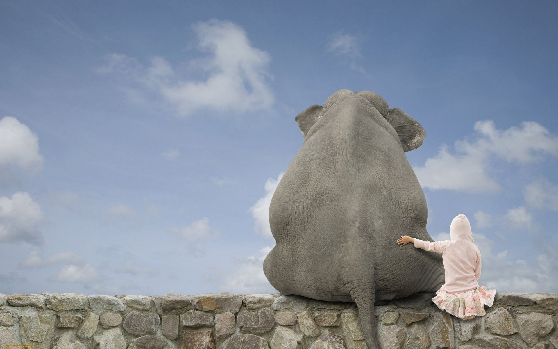 Девочка в обнимку со слоном на фоне неба - обои на рабочий стол